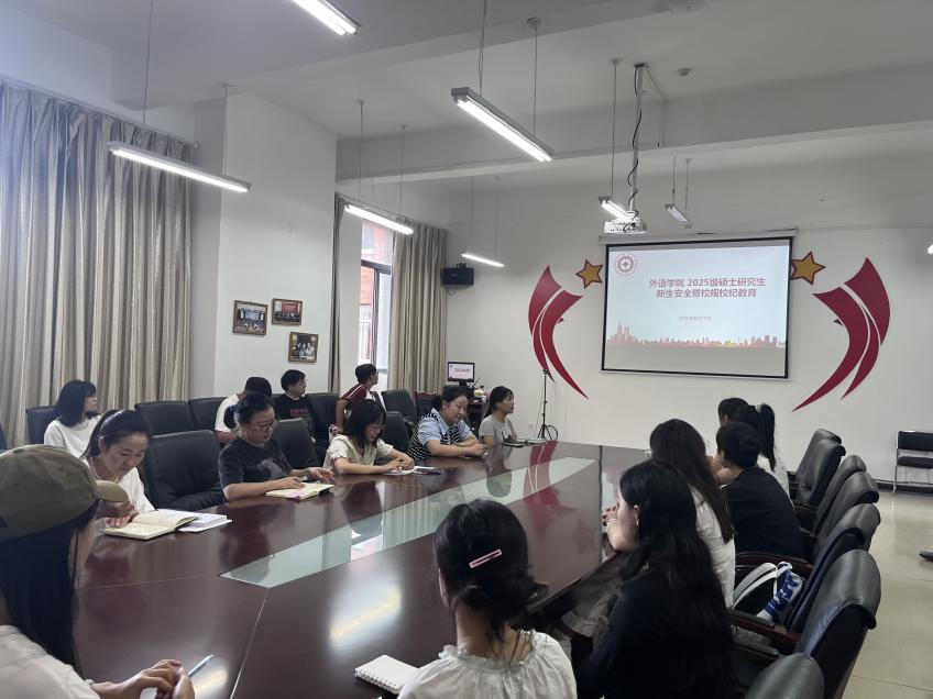 于8月25日在励学楼301会议室举行2025级研究生新生见面会暨安全教育活动。学院党委副书记汪欢、副院长唐丽君、学科办老师张夕、研究生辅导员申恒和2025级研究生参加。