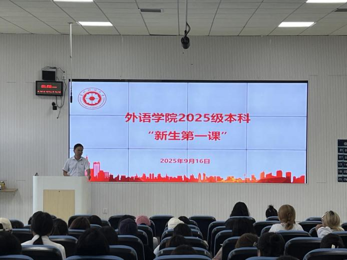 见面会的最后,学院党委书记黄贵平为 2025 级新生讲授 “新生第一课”。他强调,外语不仅是沟通的工具,更是传递中国声音、促进文明互鉴的载体,希望新生们在学习过程中始终牢记 “国之大者”,将个人理想与国家发展紧密结合;同时,要珍惜大学时光,主动克服学习中的困难,不断提升专业能力与综合素养,以优异的成绩回报家庭与社会。黄书记的授课既有思想高度,又贴近新生实际,为新生们的大学生活指明了方向,让大家深受启发。