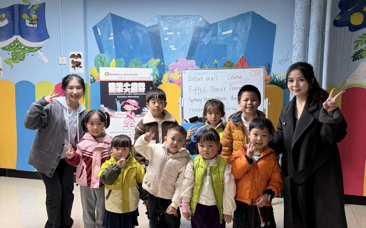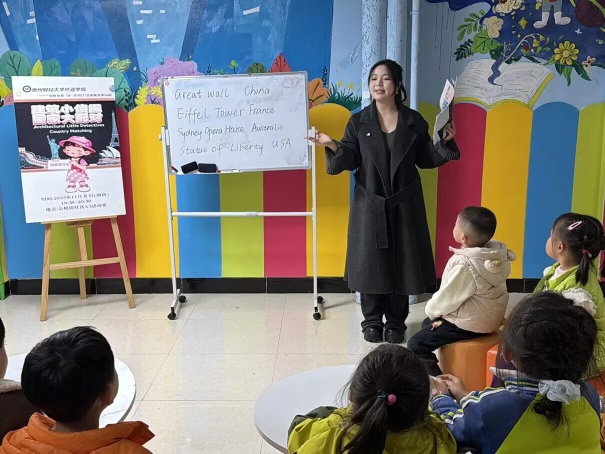 “贵财有爱 ‘语’你同行”第54期志愿者姜园园、石如美、杜威威、白柯瑞,在西校区公租房社区A3活动室带来“建筑小侦探,国家大配对”主题教学,用趣味游戏与文化小故事,为小朋友打造了一场寓教于乐的英语探索课。