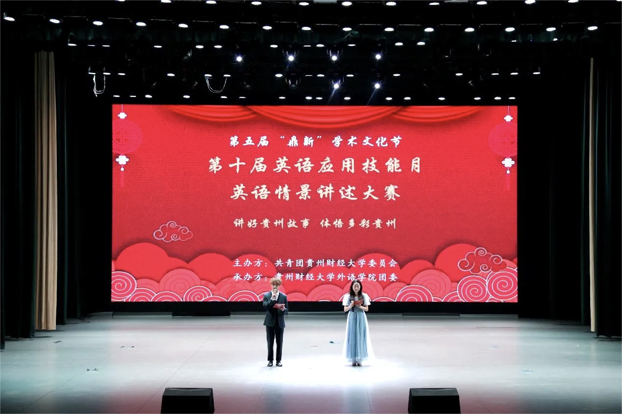 团委协办的第五届“鼎新”学术文化节之第十届"英语应用技能月"——英语情景讲述大赛决赛于2025年11月18日在学生活动中心大礼堂圆满落幕。本次比赛的主题为:讲好贵州故事,体悟多彩贵州。
