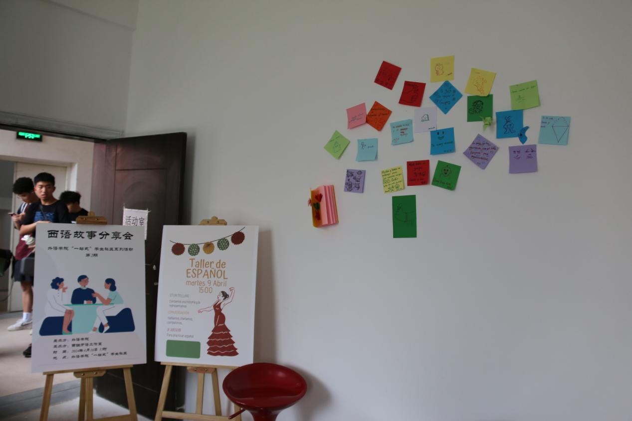 随后,老师带领同学们画画和做手工,同学们把自己的作品贴在活动室的展示墙上,让西语角的活动氛围更上一层楼。