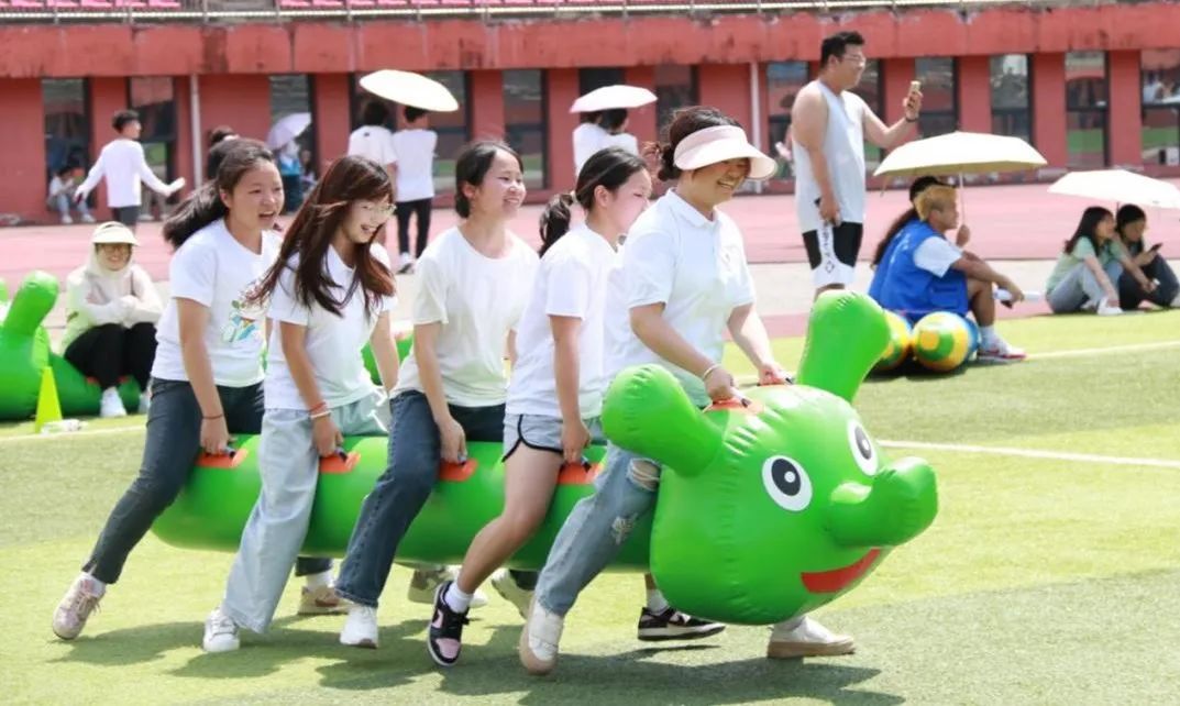 的学子们也充分展现了他们的团队协作和竞技精神。他们骑在毛毛虫道具上,协调配合,奋力向前;他们手拉雷霆鼓的延长把手,将活力球颠起,每一次成功颠球都赢得了观众们的喝彩。