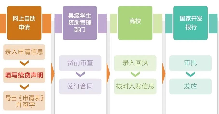 注意事项:如果需要更换新的共同借款人办理续贷,学生需要和新的共同借款人一同前往县级学生资助管理部门现场办理。