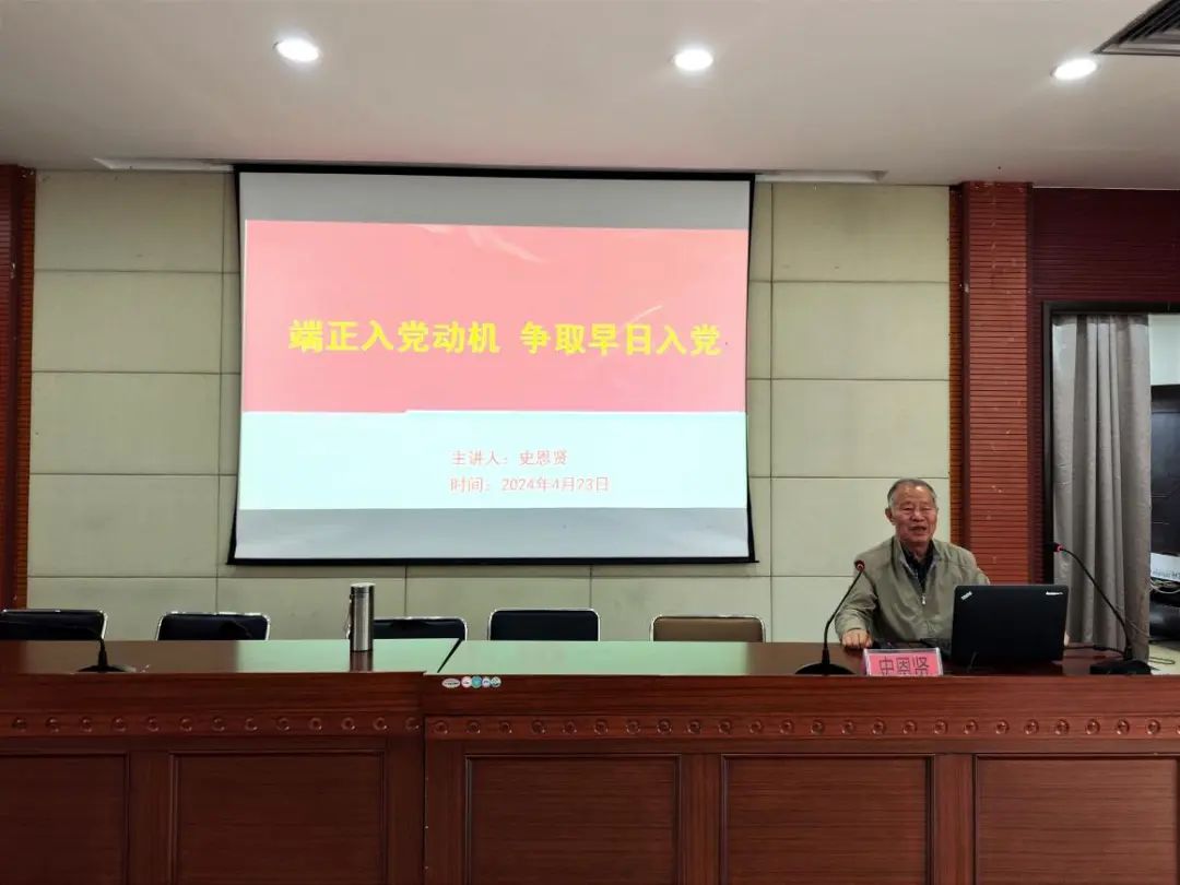 在励学楼401会议室为2024年春季入党积极分子培训班开展专题培训。学校特邀党建组织员史恩贤老同志受邀作题为“端正入党动机 争取早日入党”的专题讲座,培训班学员集体参加。
