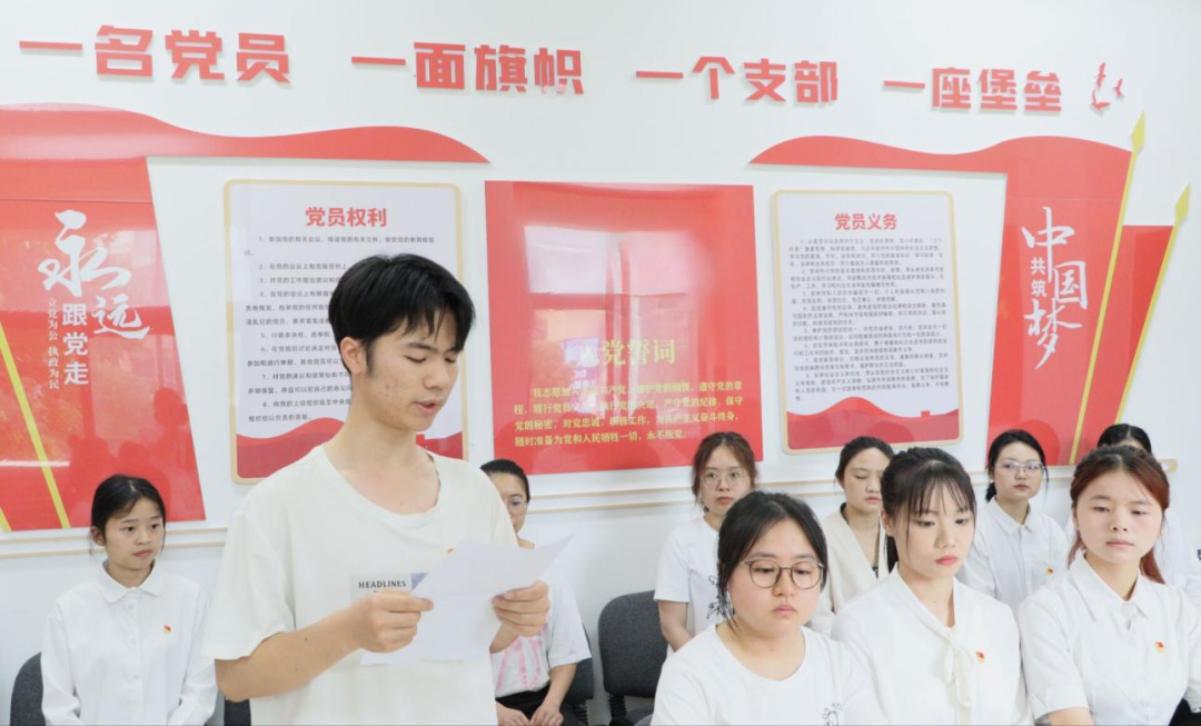 党委在玉兰苑一栋“一站式”学生社区党团活动室举行新党员入党宣誓仪式。学院党委副书记王钊、汪欢,学生党支部书记申恒、陈欢、刘鹏程及29名新党员参加仪式。学院副科级专职组织员黄娜主持仪式。