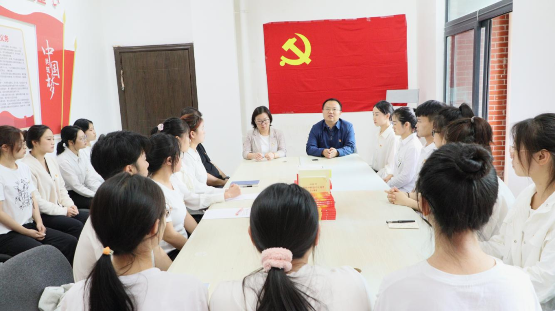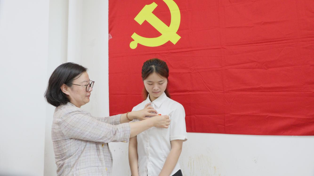 仪式开始前,黄娜宣读了新党员名单,党委副书记王钊、汪欢分别为新党员代表佩戴党徽。