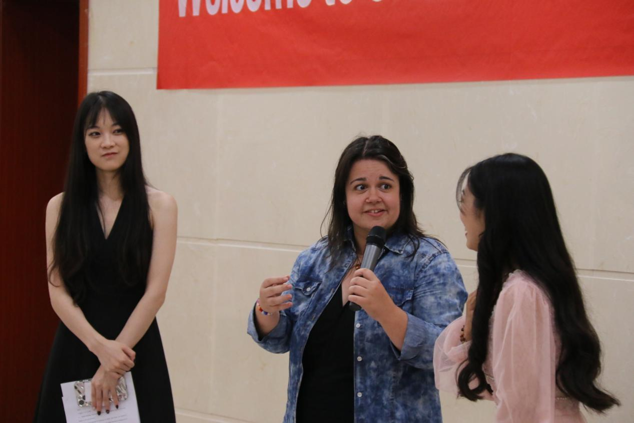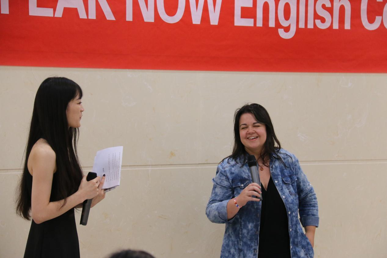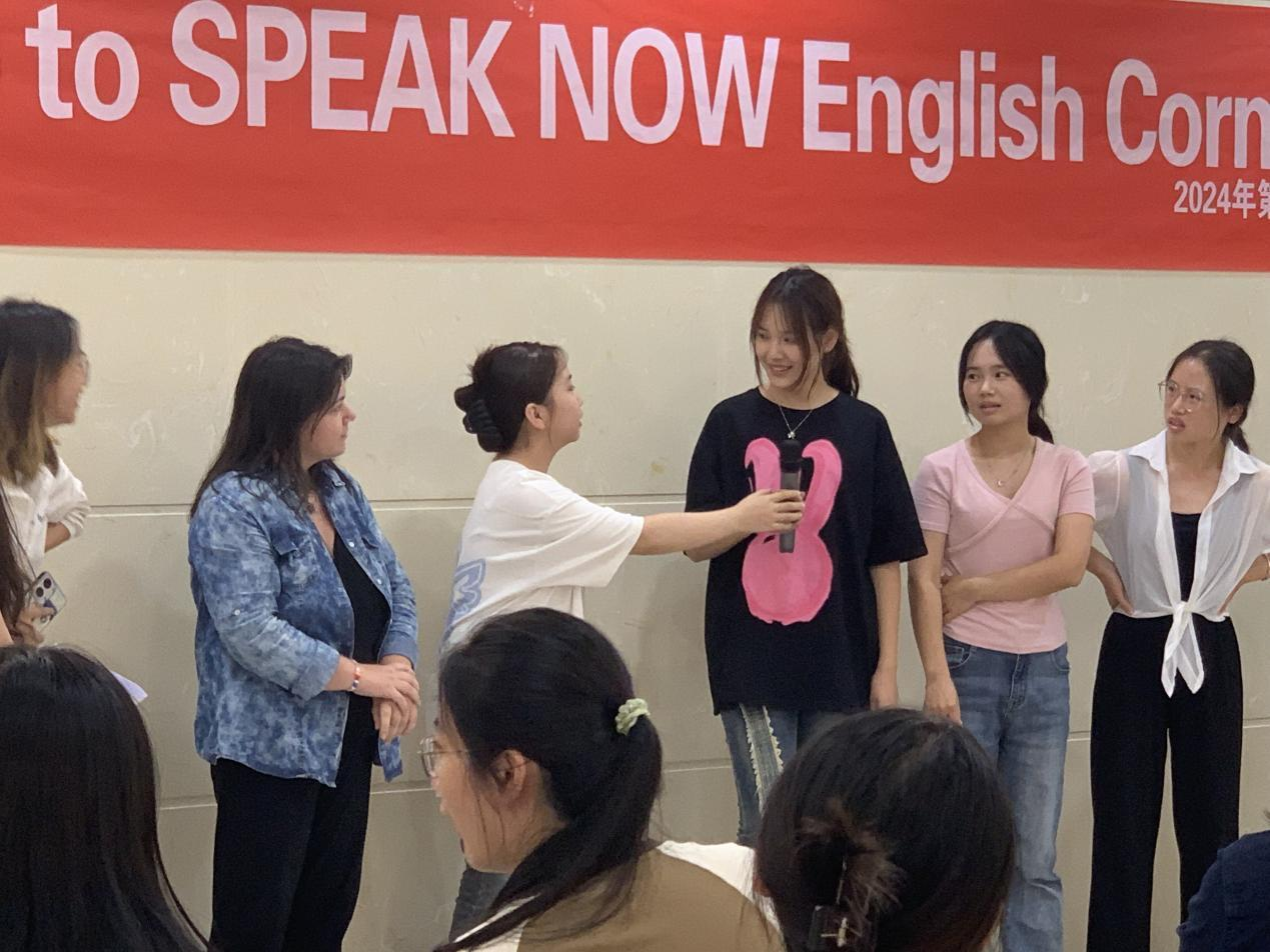 在主持人的邀请下,外教Caroline Navarrina上台跟大家分享了她最喜欢的城市和景点,同学们有一种身临其境的感觉,都踊跃把自己喜欢的城市和景点分享给大家,这种交流随意、亲切且具有感染力,真人、真事、真景,像是一幅“全息图”,引人入胜,也提升了同学们的口语表达能力。