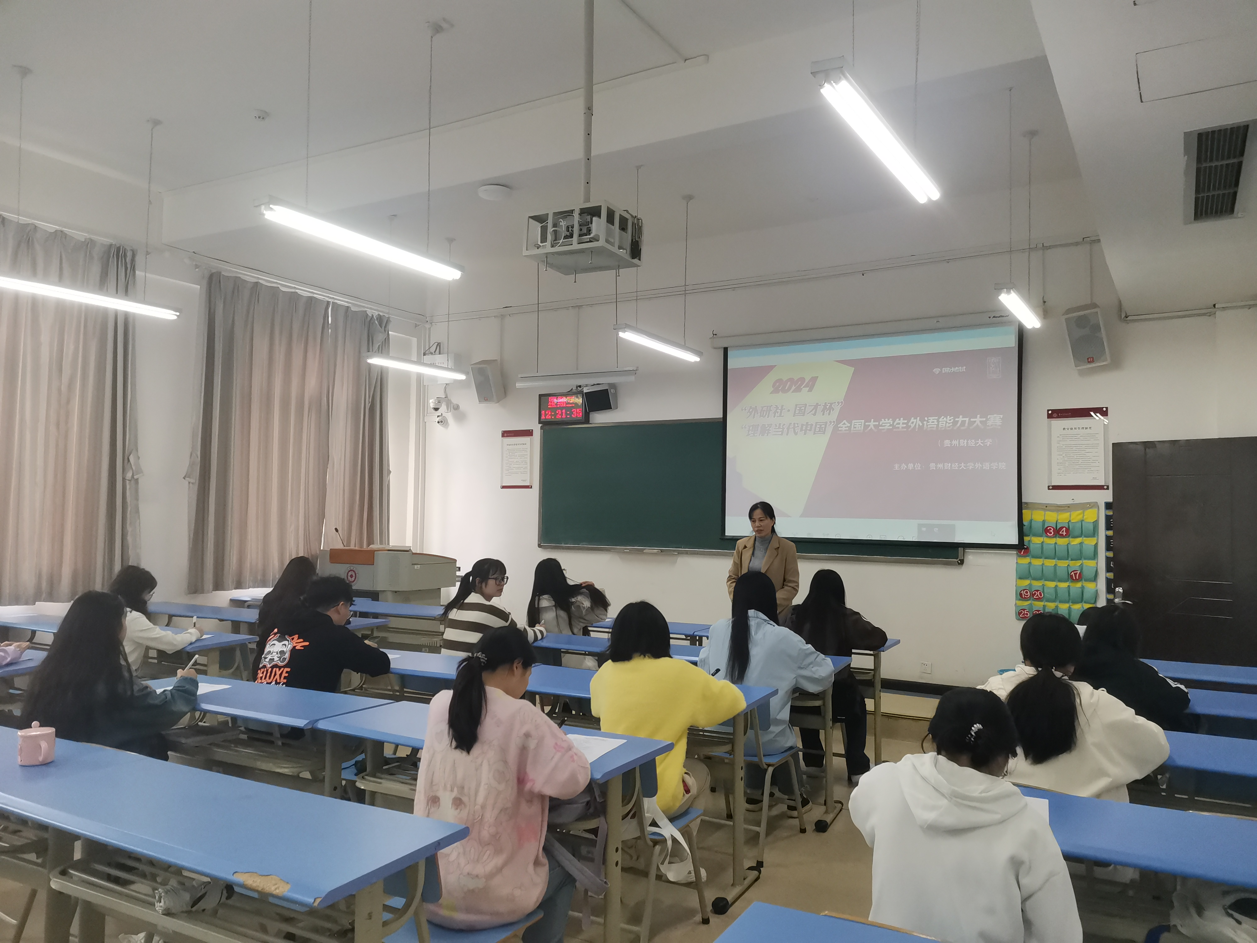 笔译选拨赛在博学楼318、320两个比赛场地举行,比赛时长为120分钟。着重考查选手的英语应用能力、翻译理论知识和基本技能、中国传统和当代优秀文化的了解及国际视野和跨文化能力等综合素养。选手们考试认真且专注。本次比赛将选拔出的3名选手参加贵州省赛区决赛。