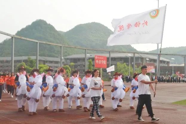 方阵精神饱满、英姿飒爽,他们以英语、法语、西班牙语、葡萄牙语和日语向大家问候致意,这样丰富多彩、独特个性的入场表演赢得在场师生阵阵掌声,将外院学子的青春活力和专业特色展现得淋漓尽致,更是将开幕式氛围推向新的高潮。