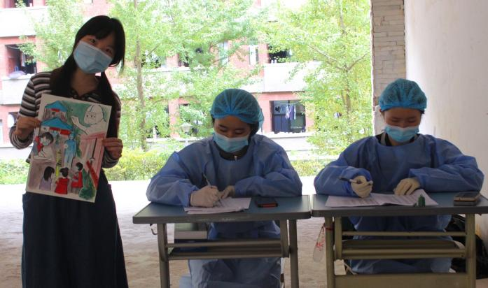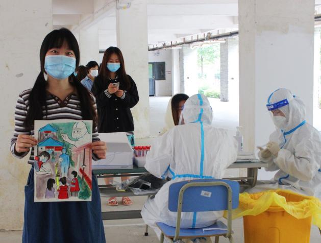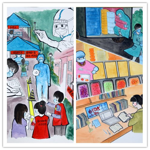 在李娜同学的画作中,有“逆行”抗疫的医务人员,有身穿红色马甲的学生志愿者们,也有保供物资的教职工志愿者和保障一餐一饭的食堂阿姨们。