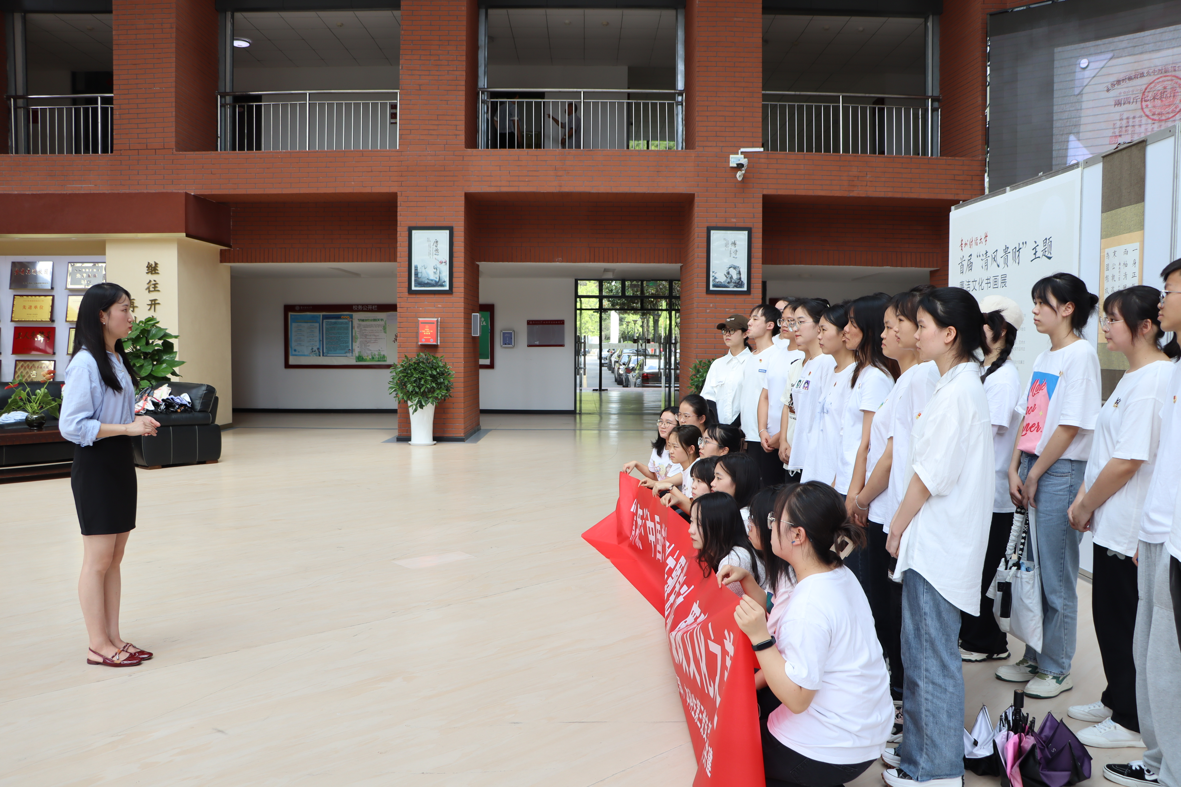 活动开始前,陈欢为全体党员同志介绍了学校举办“清风贵财”主题书画作品展的目的和意义,并希望全体青年学生党员,要通过本次主题结对共建,认真感受和领悟廉洁、廉政文化之美,树立崇德向善的价值观。