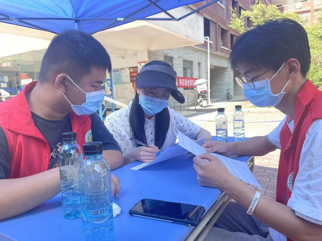 辅导员刘天琪同志作为学生宿舍玉兰苑3栋的志愿者,与学生志愿者一起核对完成检测宿舍名单。