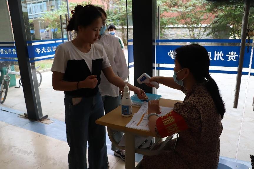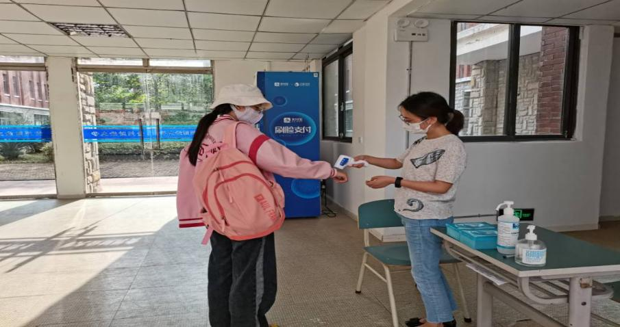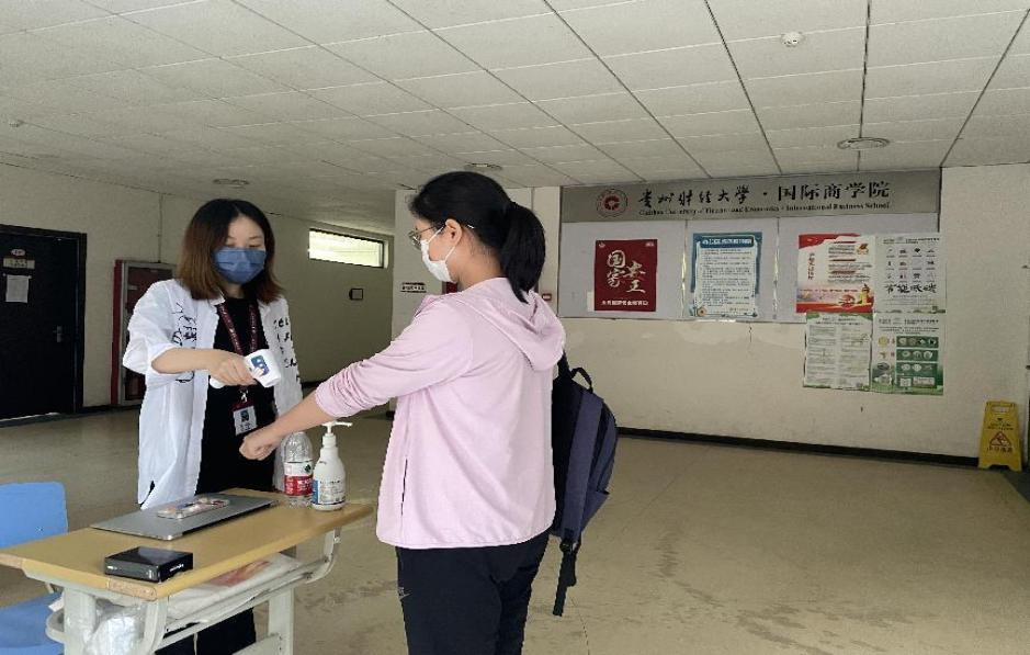 熊晶晶老师在勤学楼入口为进入自修室的同学检测体温