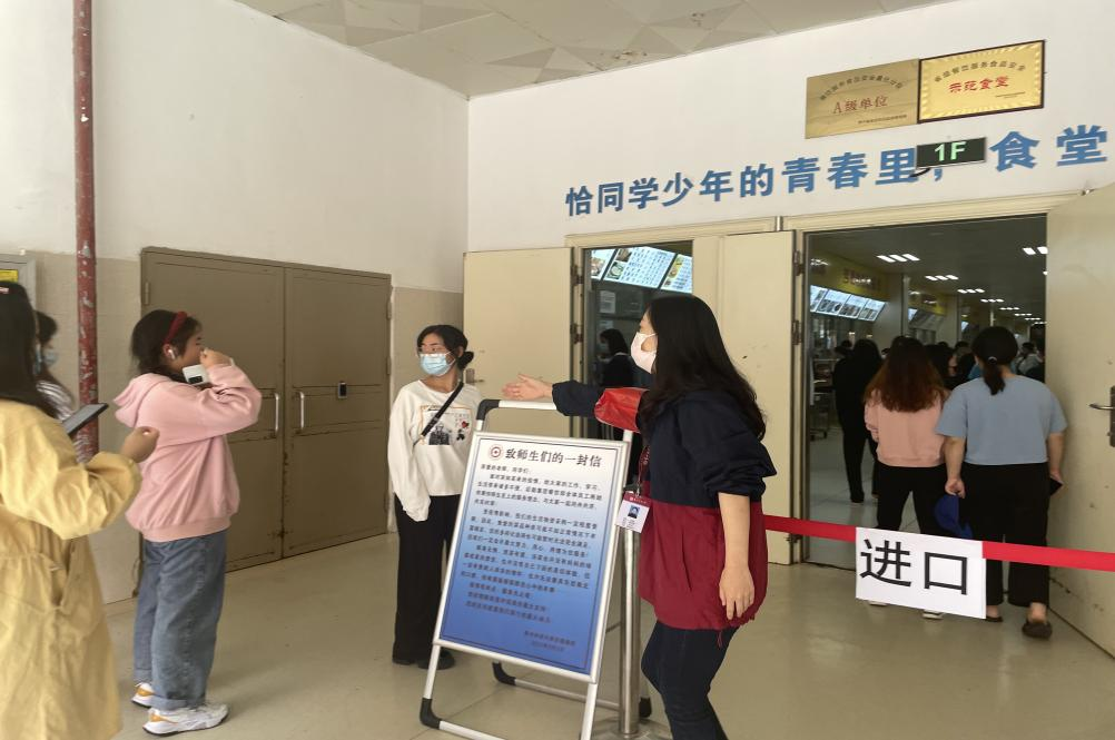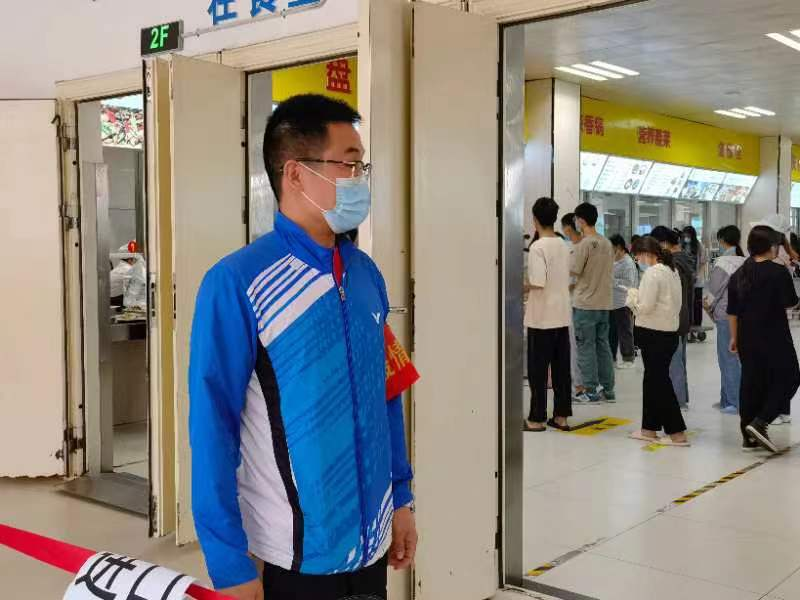 杨清(家属)在二食堂入口值守,提醒师生们戴好口罩,用餐保持安全距离