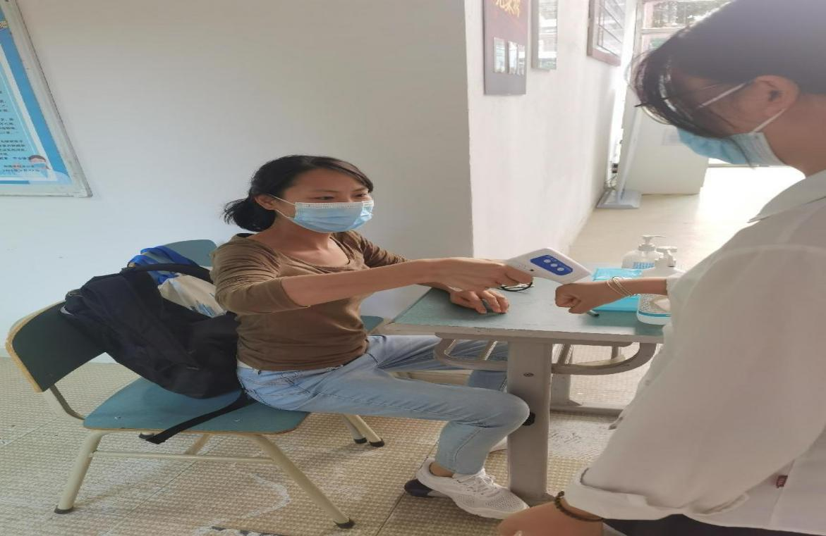 符玉梅老师在勤学楼为进入自修室的同学进行体温检测