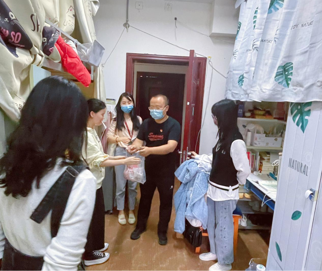 在玉兰苑、丹桂苑研究生宿舍,张虹院长叮嘱研究生同学们要积极配合学校管理和疫情防控工作,在认真做好个人防护的同时也要静下心来,认真读书,增强学术科研能力和翻译技能。