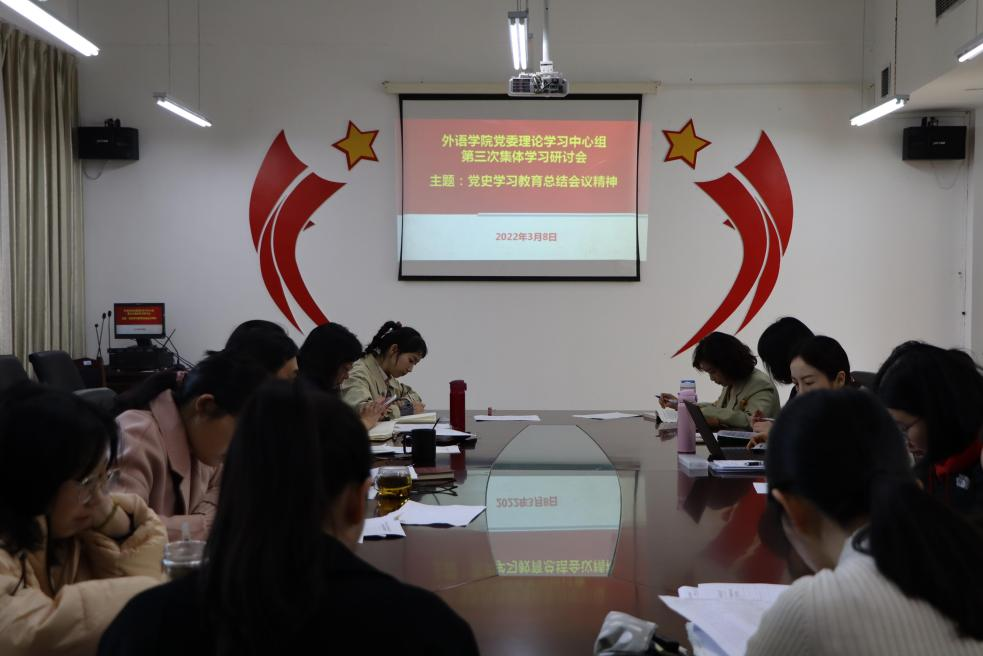 3月8日上午,根据党史学习教育工作安排,院党委理论学习中心组聚焦党史学习教育专题——2022年集体学习,在励学楼301会议室举行了2022年度第三次集体学习研讨会。院领导、党支部书记、科级干部和系部主任参加学习,院党委书记胡张林主持会议。