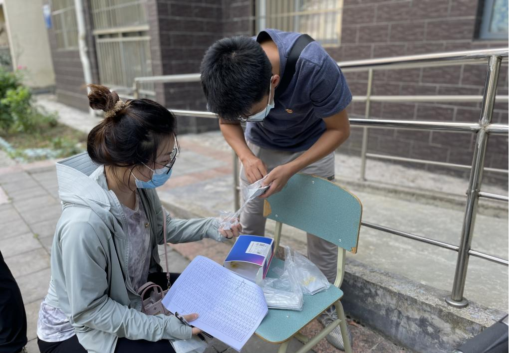 “时间紧、任务重,咱们必须抢时间,快速高效、准确无误的完成每一户的排查和检测工作......”王钊迅速完成小组分工、物资分发,志愿者们抢抓时间,逐层、逐户开展抗原检测工作。