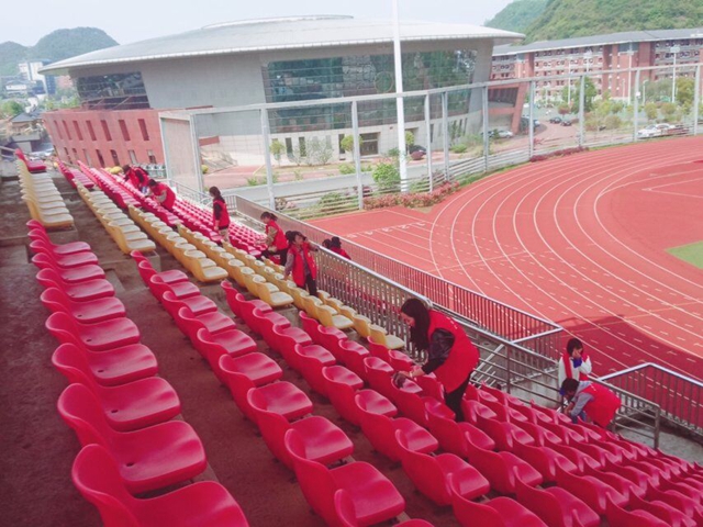 本次打扫的重点主要是足球场观众席及运动场跑道,志愿者们用自己从宿舍带来的盆子、抹布、扫把等工具,顶着烈日,以饱满的精神、积极的态度将观众席及跑道被打扫得干干净净。