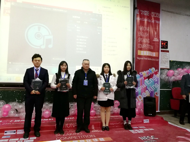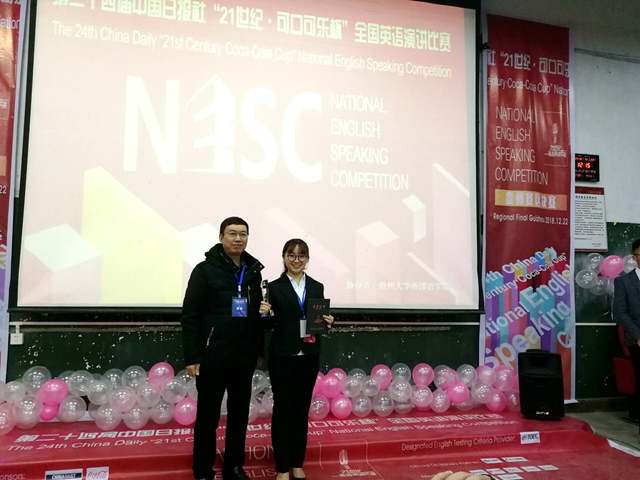 2018年12月22日上午,中国日报社“二十一世纪可口可乐杯”全国英语演讲比赛,贵州赛区总决赛在贵州大学北校区法阶三教室举行。我校工商学院毛帅,会计学院石岚代表学校参赛。奖项设置为冠亚季军各一名,一等奖三名,二等奖四名三等奖五名。进过激烈的角逐,两位参赛选手在十六名选手中脱颖而出,石岚获得贵州省季军(指导教师:肖菊),毛帅获得贵州省二等奖(指导教师:高彩慧)的好成绩。