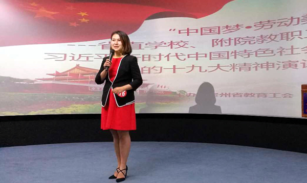在全省教育工会决赛中,周蕾老师动情的分享了学生思政工作的点滴故事,回答了辅导员在“为谁培养人、培养什么人、怎样培养人”问题上的使命与责任,获得评委点赞,并在十九大精神知识问答环节以满分通过,最终在演讲比赛中,获全省教育工会二等奖。