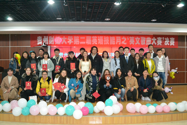 随后,举行了英语技能月系列活动颁奖典礼,李文龙、胡张林、陈波为同学们颁奖并合影。通过此次比赛,同学们表示从中获益颇多,最重要的是把对英语的热爱和对音乐的热情相结合,这样使得同学们既能有效的学习英语,又能让大家的课余生活更加丰富多彩。