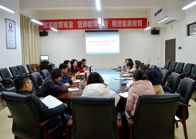 在励学楼301会议室召开新学期教学工作例会。学院党委书记胡张林、院长王健芳、党委副书记张忠民、副院长陆敏、各系部主任及全体教务人员参加会议。