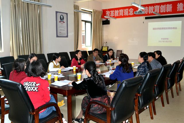 在国际学院英语课程任务落实方面存在的困难。会议讨论了如何解决国际学院英语课程师资不足的问题,范处长提出了许多解决预案,比如,向人事处和国际关系处发函请求提供有英语背景老师的名单等。会议决定,将会议讨论结果报校领导批示。