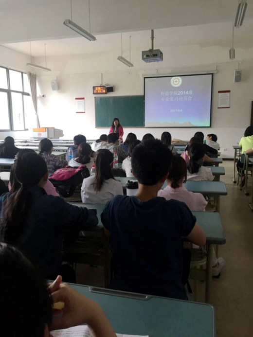 6月6日,色色动漫 在博学楼1-22举行2014级学生专业实习动员大会。学院副书记张忠民,副院长雷晴岚,英语系主任张春、吴艳,日语系主任袁先婷及2014级全体同学参加了此次实习动员大会。