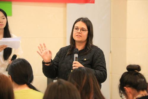 测试结束后,主持人鼓励同学们结合自身经历,用英语分享自己的测试结果。有的同学表示自己是典型的“I人”(内向型),喜欢独自思考,享受安静的个人空间;有的同学则称自己是“E人”(外向型),热衷于社交活动,在人群中充满活力。现场讨论声此起彼伏,思想的火花不断碰撞。