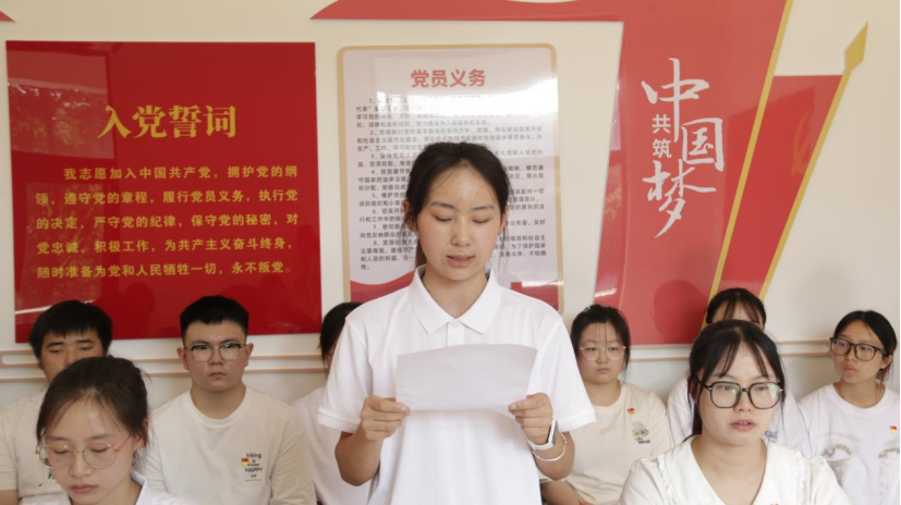 主题党日在庄严的《国际歌》中开始,随后研究生党支部书记张夕宣读了新党员名单,并带领全体新党员面向鲜红的党旗进行了宣誓。全体同志声音坚定而洪亮,誓言字字铿锵、句句千钧,表达了对党的无限忠诚和为共产主义事业奋斗终身的决心。