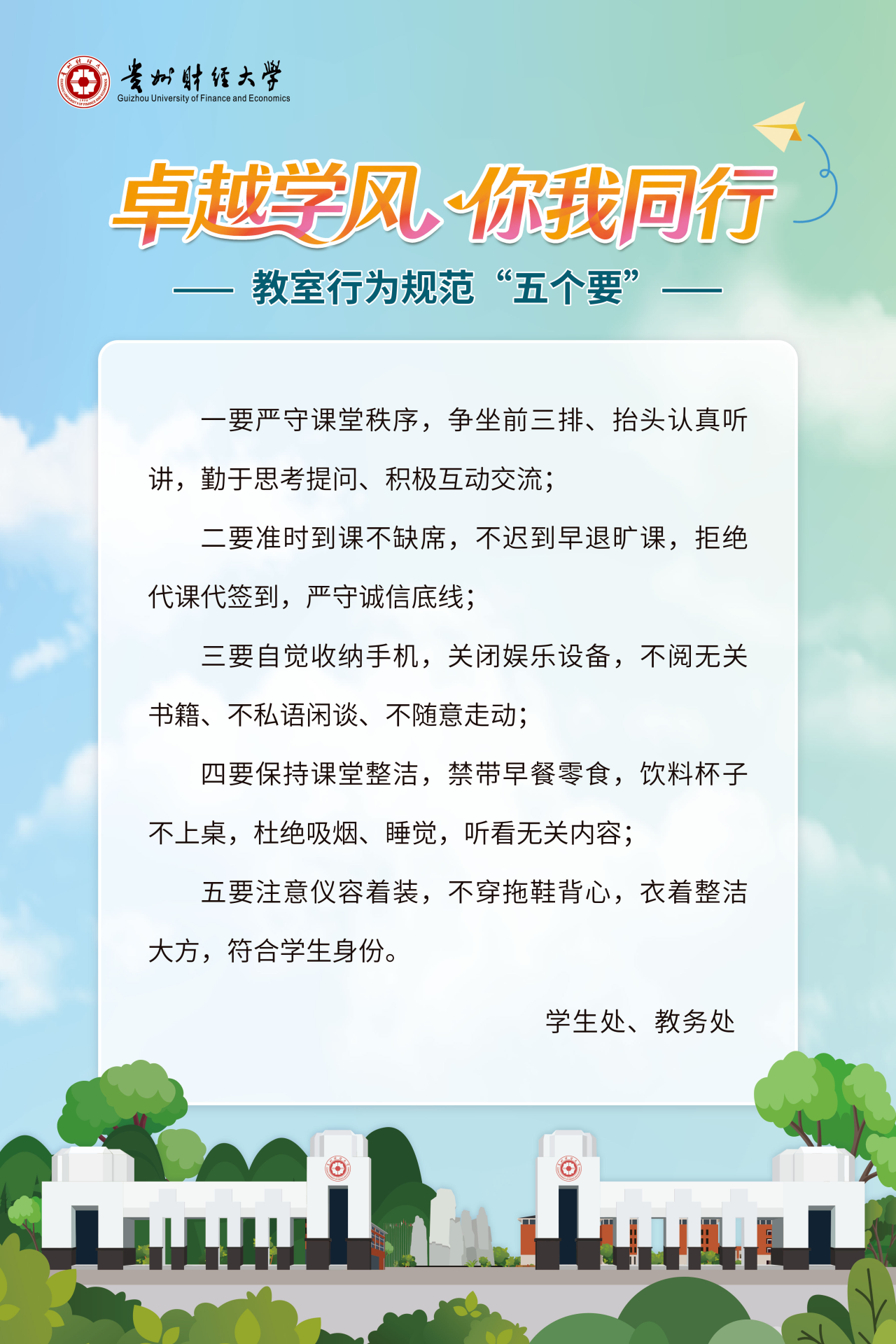 贵财校园浸润书香,外语课堂孕育素养。教室是我们的核心学习场域,学风的优劣直接影响成长成才的深度,课堂言行的规范更直观彰显外语学子的综合风貌。为厚植优良学风土壤、明晰课堂行为准则,色色动漫 特向全体同学发出倡议 —— 践行《教室行为规范 “五个要”》,携手打造专注高效、文明有序的课堂生态。
