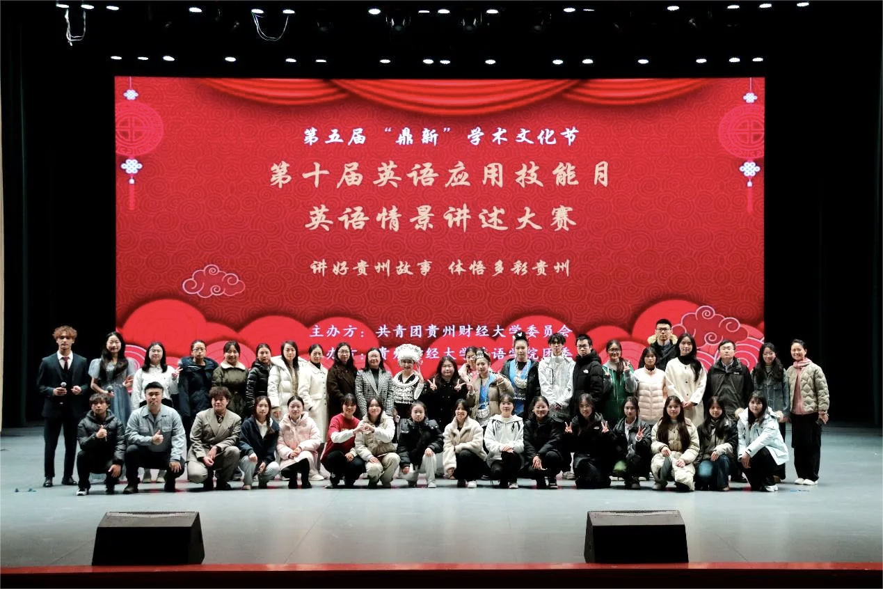 团委协办的第五届“鼎新”学术文化节之第十届"英语应用技能月"——英语情景讲述大赛决赛于2025年11月18日在学生活动中心大礼堂圆满落幕。本次比赛的主题为:讲好贵州故事,体悟多彩贵州。