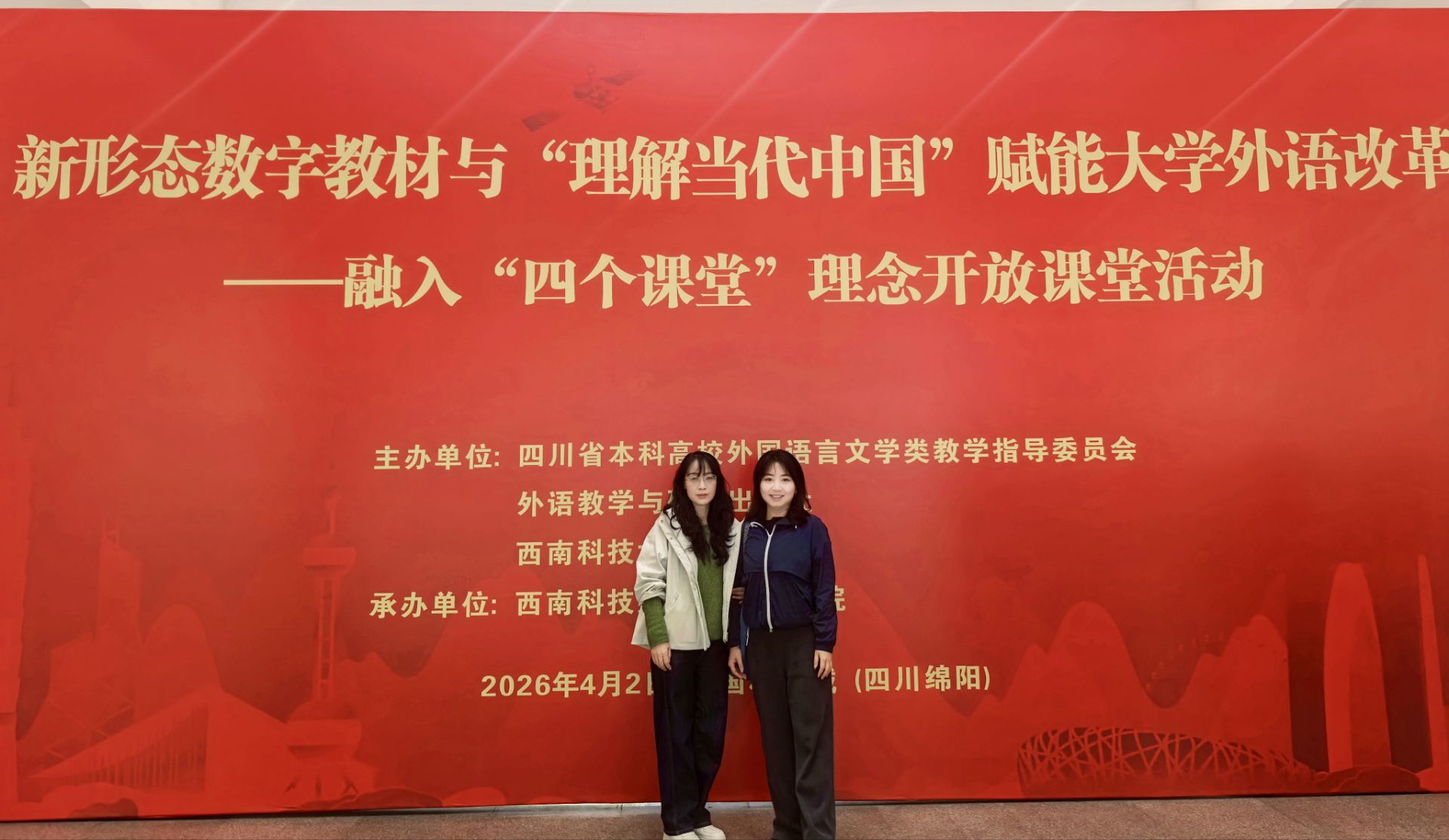 大学外语第一教学部教研室副主任杨莎老师与郭毓老师赴四川绵阳参加了由西南科技大学外国语学院、外语教学与研究出版社、四川省本科高校外国语言文学类教学指导委员会及四川省高等教育学会高校外语专业委员会联合主办的“新形态数字教材与‘理解当代中国’赋能大学外语改革——融入‘四个课堂’理念开放课堂活动”。