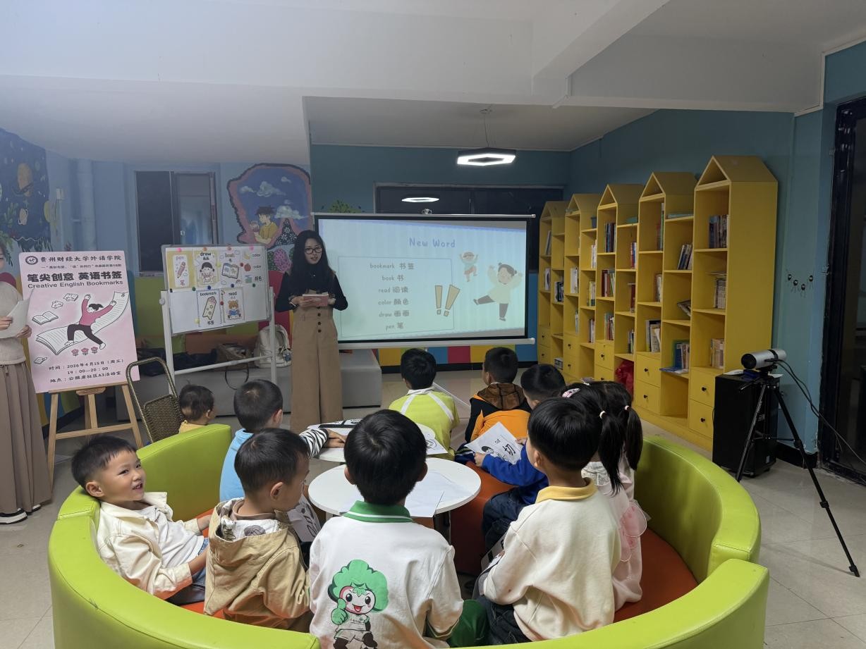 活动开始,志愿者邓锐琦用英文和小朋友打招呼,亲切的互动瞬间拉近了距离。一首欢快的《Bookmark Song》响起,大家跟着节奏拍手律动,课堂气氛立刻活跃起来。一款款精致的英文书签逐个亮相,“What’s this?”的提问引发孩子们好奇,bookmark一词自然走进课堂。