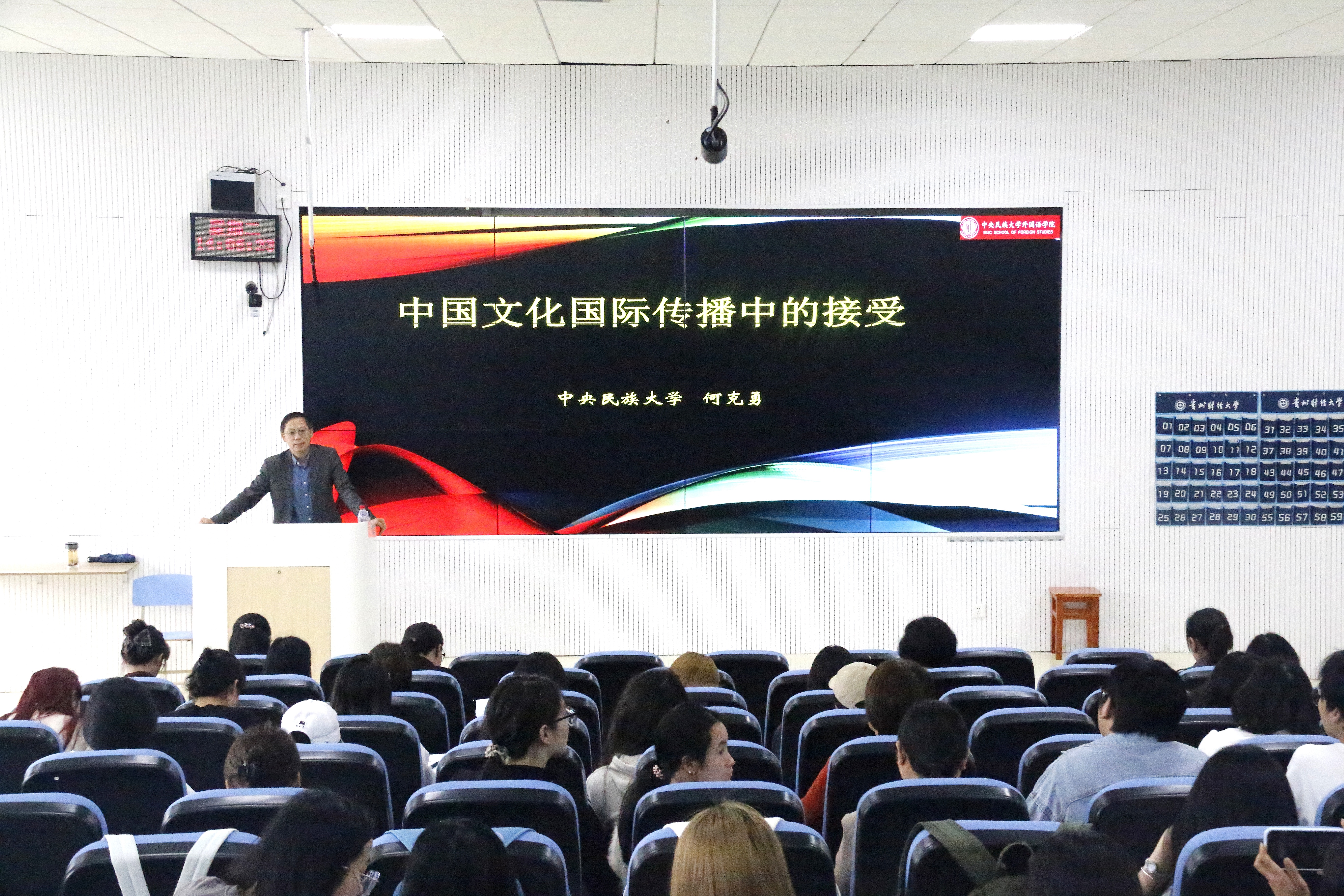 何克勇教授深耕翻译与国际传播领域多年,学术积淀深厚、实践经验丰富。讲座中,何教授以中国文化国际传播中的读者接受为核心主题,结合口笔译实务、国际传播案例与前沿研究成果,深入浅出剖析跨文化传播的核心逻辑与实践路径,细致解读文化外译、对外交流中的难点与技巧,为同学们搭建起理论与实践互通的学习桥梁。