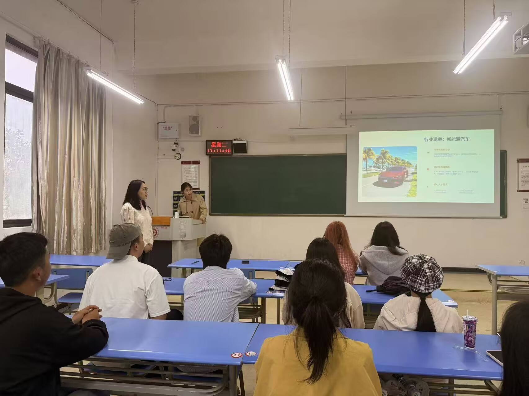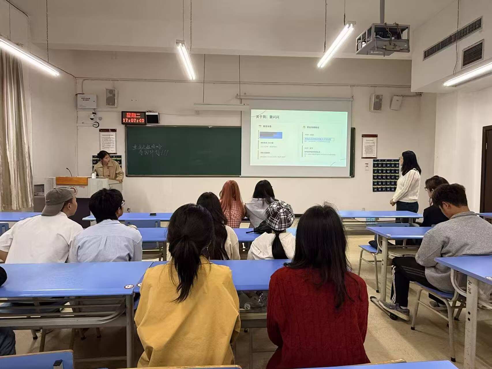 随后,学姐结合当下就业市场形势,围绕行业洞察、职业发展、求职技巧与个人成长四大板块展开干货分享。她以新能源汽车等领域为例,分析了当前热门行业对西班牙语专业人才的需求与能力要求,梳理了外语专业的多元就业方向,打破了同学们对专业就业的刻板印象。同时,她特别强调了证书与技能的重要性,鼓励同学们尽早规划,考取专业八级、导游证等含金量高的证书,用硬核实力为简历加分,以及建议同学们利用课余时间主动学习、深耕实用技能,比如熟练掌握计算机基础操作、办公软件运用等通用技能。