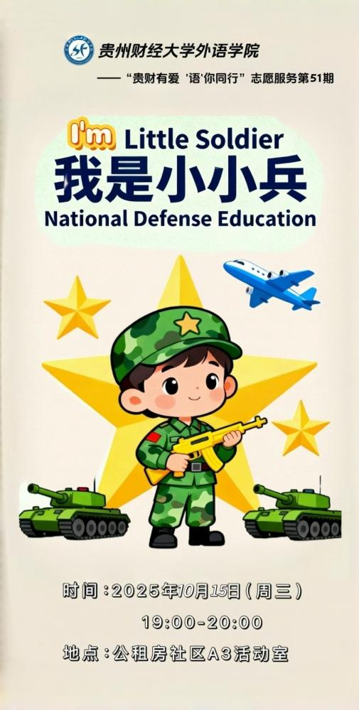 “贵财有爱 ‘语’你同行”志愿服务第51期志愿服务活动来啦!本期志愿服务以“我是小小兵,童心爱国防”为主题,为小朋友们揭开国防奥秘之门。一场特别为孩子们打造的国防启蒙之旅即将启程!