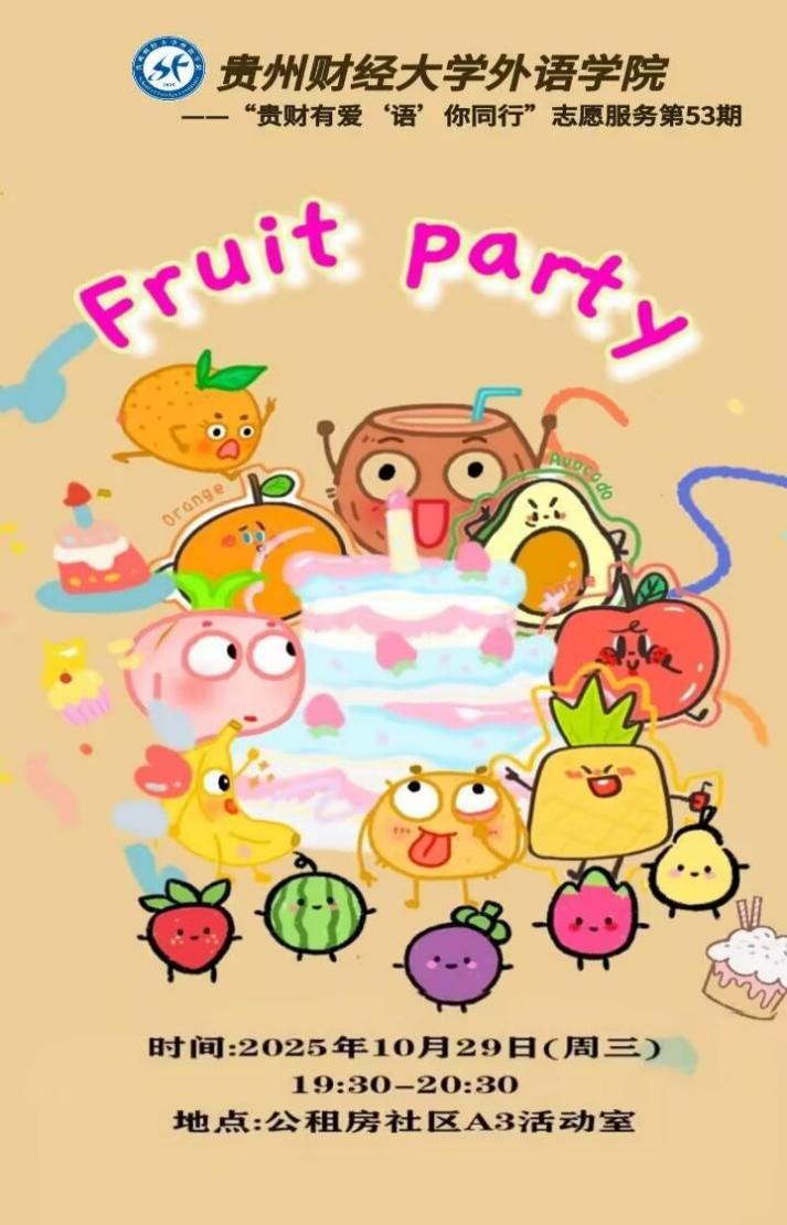 “贵财有爱 ‘语’你同行” 志愿服务第 53 期志愿服务活动来啦!本期以 “Fruit Party” 为主题,让孩子在趣味氛围中认识水果词汇、学说英文句子,开启一段欢乐又有收获的英语学习之旅!