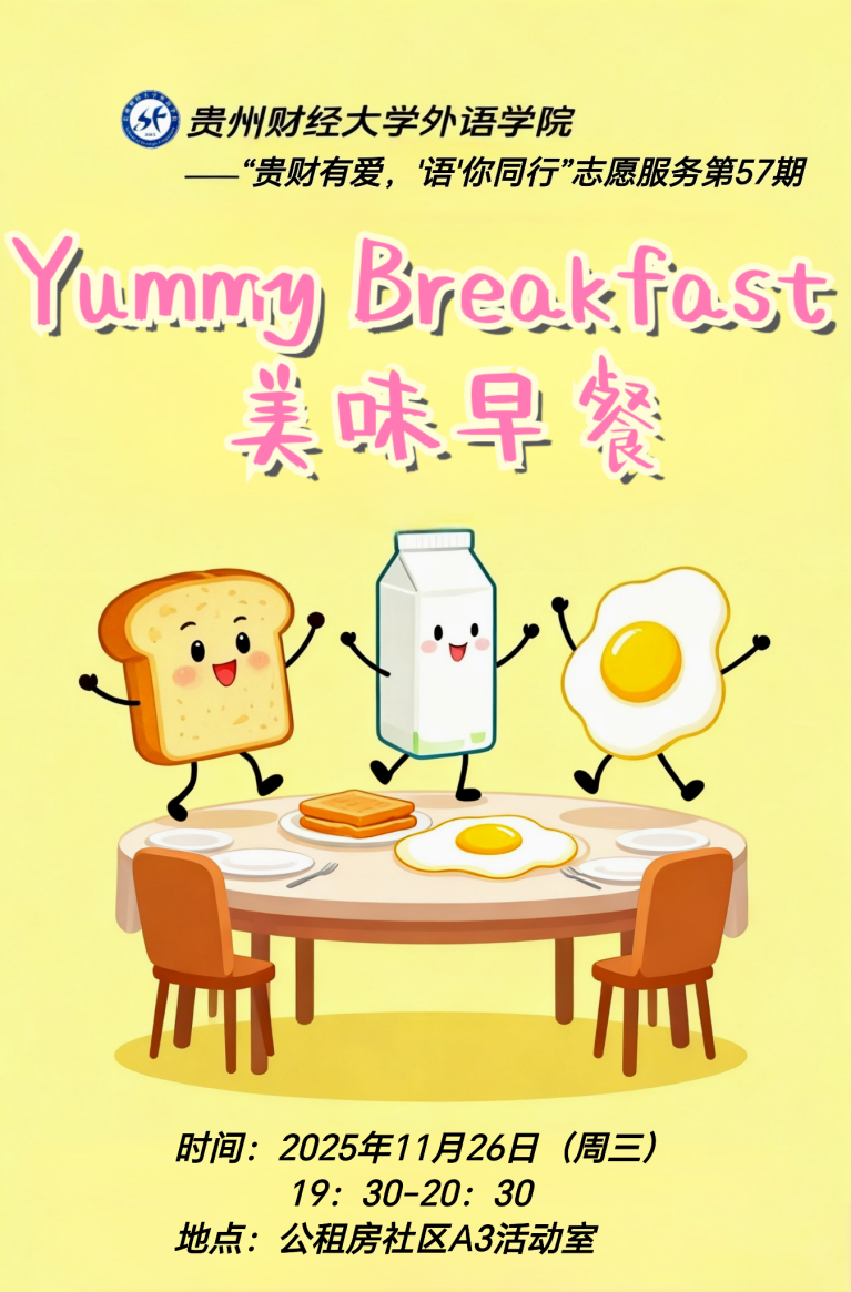 香气与童趣碰撞,英语与美食相遇!一场充满惊喜的语言探索之旅即将开启!“贵财有爱 ‘语’你同行”志愿服务第57期,热情启航!本期以“Yummy Breakfast”为主题的英语课堂,藏着解锁英语世界的奇妙钥匙。松软面包、香浓牛奶、营养鸡蛋等清晨美食,将化作生动的学习素材,搭配儿歌律动、实物互动与趣味游戏,让孩子们在舌尖的香甜与互动的欢乐中,轻松邂逅英语,解锁表达新体验。