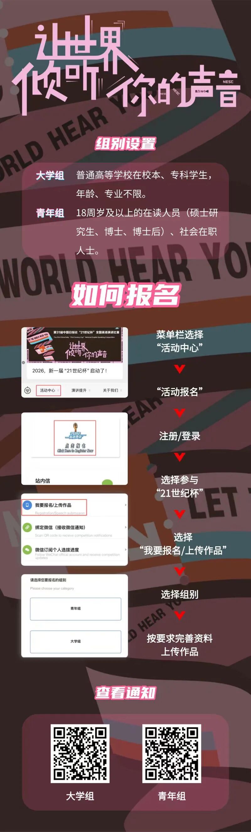 在校硕士研究生、博士研究生、博士后,选手须为中国国籍。参加过往届“21 世纪杯”全国青年英语演讲比赛全国总决赛并获得一等奖(含冠军、亚军、季军)的选手不具备参加本届青年组全国总决赛的资格。