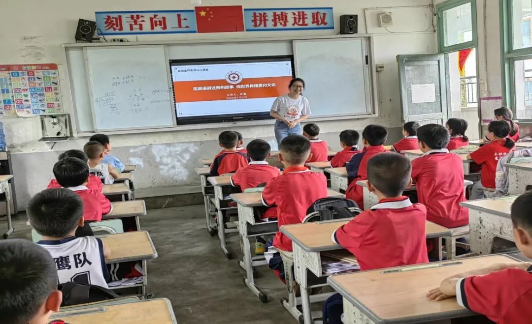 团队指导老师肖菊以“用英语讲述贵州故事 向世界传播贵州文化”为主题,向苗乡侗寨的小学生们介绍了英语学习的方法。她引导学生们思考:为什么要学英语?如何将英语学习与传播自己的民族文化联系起来?她鼓励同学们将语言学习与日常生活密切联系,在学中用、用中学,更好地用英语讲述贵州苗族和侗族的故事,传播民族文化。