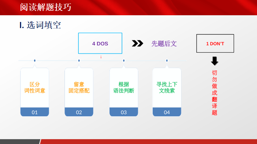 肖菊老师为参与训练营的学生准备了丰富的历年真题,采用讲练结合的方式,使学生在实践中掌握解题技巧,深入理解阅读的精髓。在讲座中,肖老师特别强调了“4 DOS 1 DON’T”的方法,帮助学生有效攻克选词填空这一难题。她建议学生在面对信息匹配和仔细阅读时,要学会寻找关键词,并利用关键词快速定位答案,从而提高解题效率。