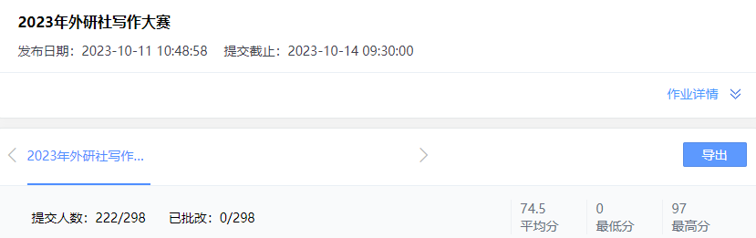写作大赛和阅读大赛校园选拔赛于10月14日通过线上方式举行。写作大赛借助iWrite平台选拔,通过议论文写作的方式选拔学生。阅读大赛通过学习通平台选拔,题型包括Read and Know、Read and Reason、Read and Question三个模块。据统计,1000余名学生参加了此次校园选拔赛,经过激烈的角逐,分别选拔出前4名选手晋级省赛。