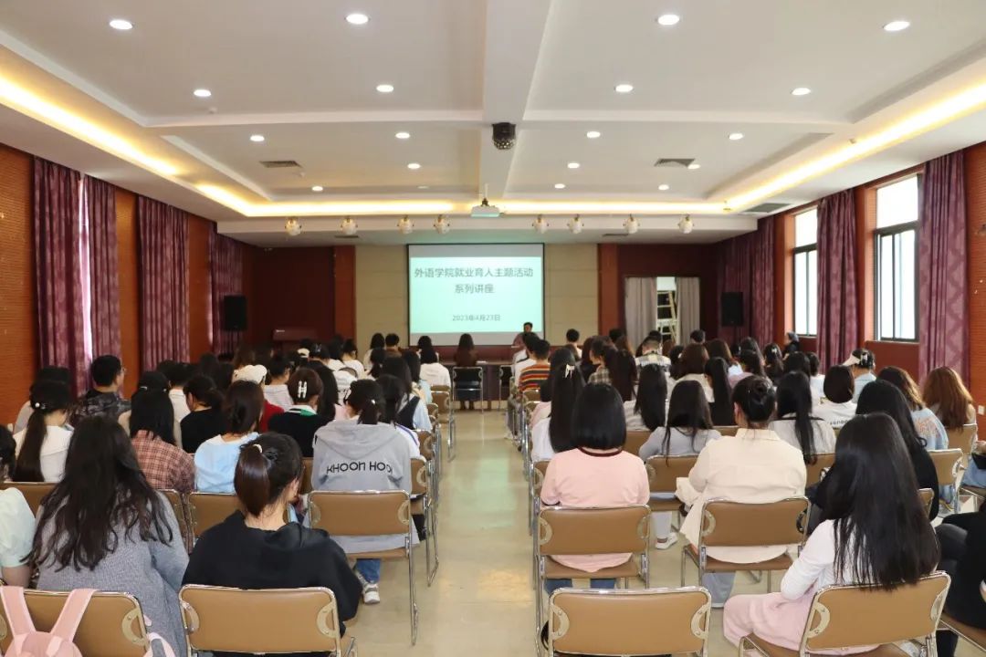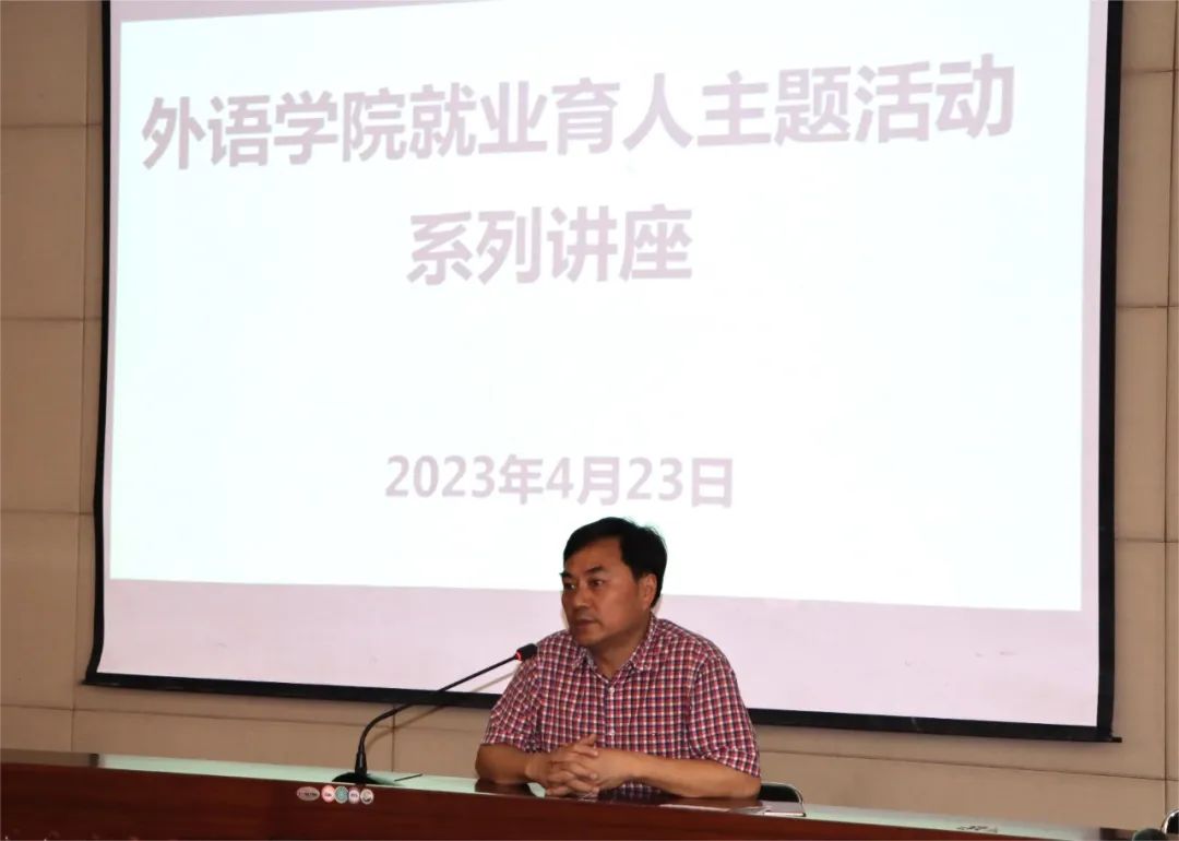 于2023年4月24日下午在401开展就业育人主题活动系列讲座--端正态度 树立正确的择业观。外院党委书记胡张林、党委副书记汪欢参加此次活动,辅导员刘天琪老师主持,2020级全体学生参加本次就业育人主题讲座。