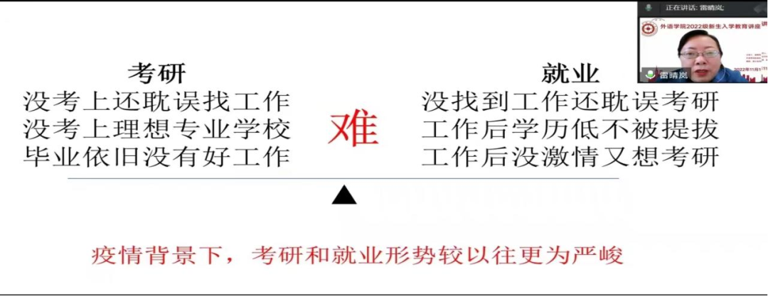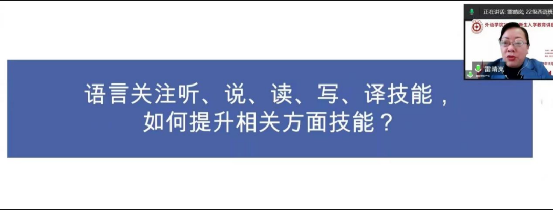 雷晴岚副院长还分析了当前考研和就业形势,帮助新生了解考研流程和语言专业学生的就业方向,殷殷嘱托新生夯实根基、稳扎稳打、早做准备。
