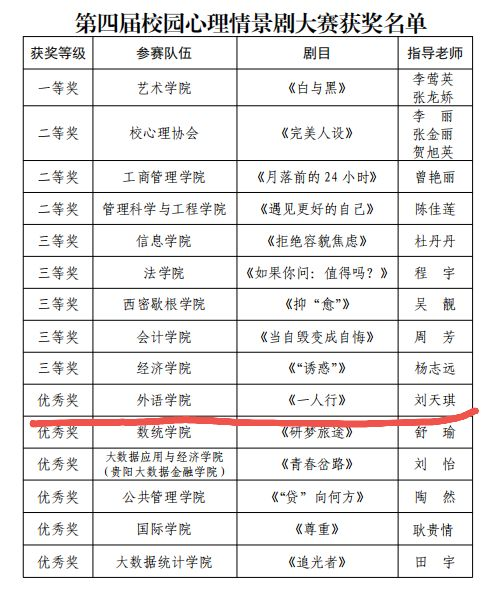 近日,在学校举办的第十一届“心梦想·心成长”为主题的心理健康文化节系列活动中,色色动漫 辅导员老师刘天琪指导的《一人行》荣获2022年度优秀心理剧本三等奖、第四届校园心理情景剧大赛优秀奖,2019级翻译班卢秀波同学荣获 2021-2022年度“十佳”心理委员。(撰稿:申恒)