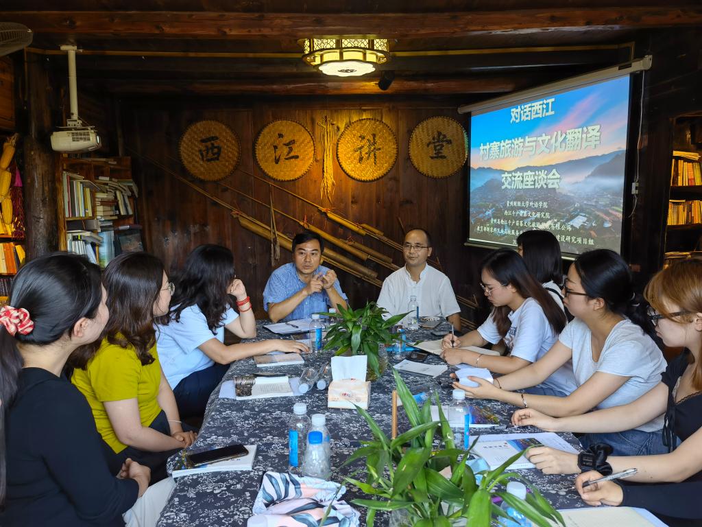 党委书记胡张林、副院长陆敏、常莉老师、参与西江苗寨导游词翻译项目的英语笔译专业研究生以及西江千户苗寨文化旅游发展有限公司代表,大家在会上进行了热烈的讨论与交流,并建立了长期友好合作关系。
