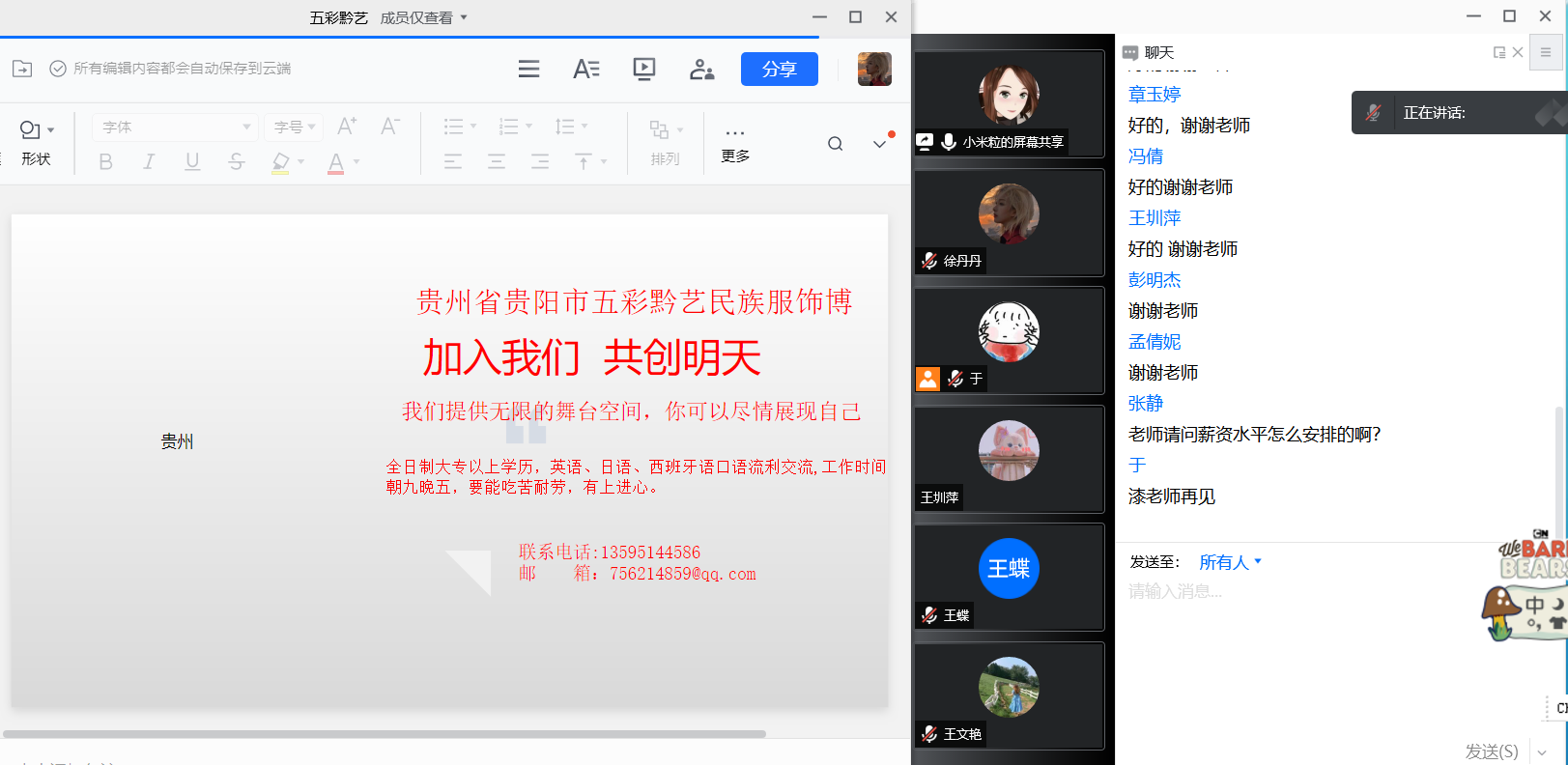 举办了2022届毕业生线上招聘宣讲会。贵州省五彩黔艺民族服饰博物馆漆芝妤老师为2022届毕业生做招聘宣讲,院党委书记胡张林、党委副书记汪欢参加了此次宣讲,辅导员于倩老师主持此次宣讲会。