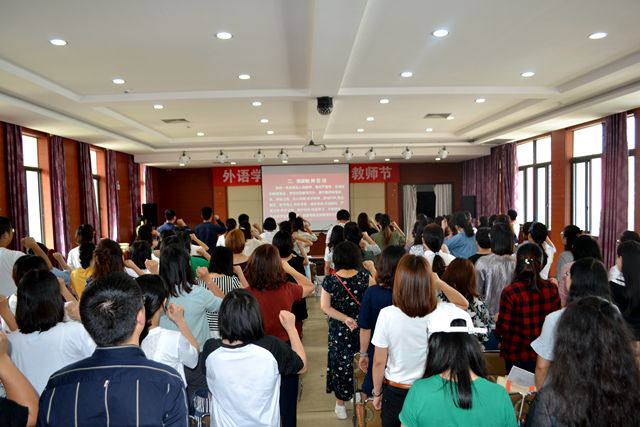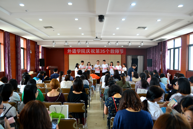 活动开始,全体人员起立,合唱《我和我的祖国》,现场氛围浓烈,展现了浓浓的爱国情。接着学院党委书记胡张林带领全体教师重温了《教师誓词》。随后,同学们表演了诗歌朗诵,并送上鲜花,为辛勤的老师送上一份诚挚的祝福,表达感恩之情,老师和学生齐唱《感恩的心》,活动达到高潮。